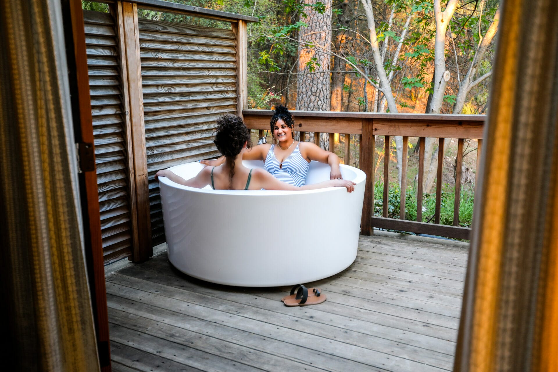 Experience tranquility among the trees with your very own private soaking tub on the redwood deck. This secluded 250 square foot cottage is perched on the edge of a forested ravine. French doors open to a beautiful redwood deck where you can unwind in the private outdoor soaking tub and lounge the day away under the trees, or spend time in front of the firepit on the stone patio.